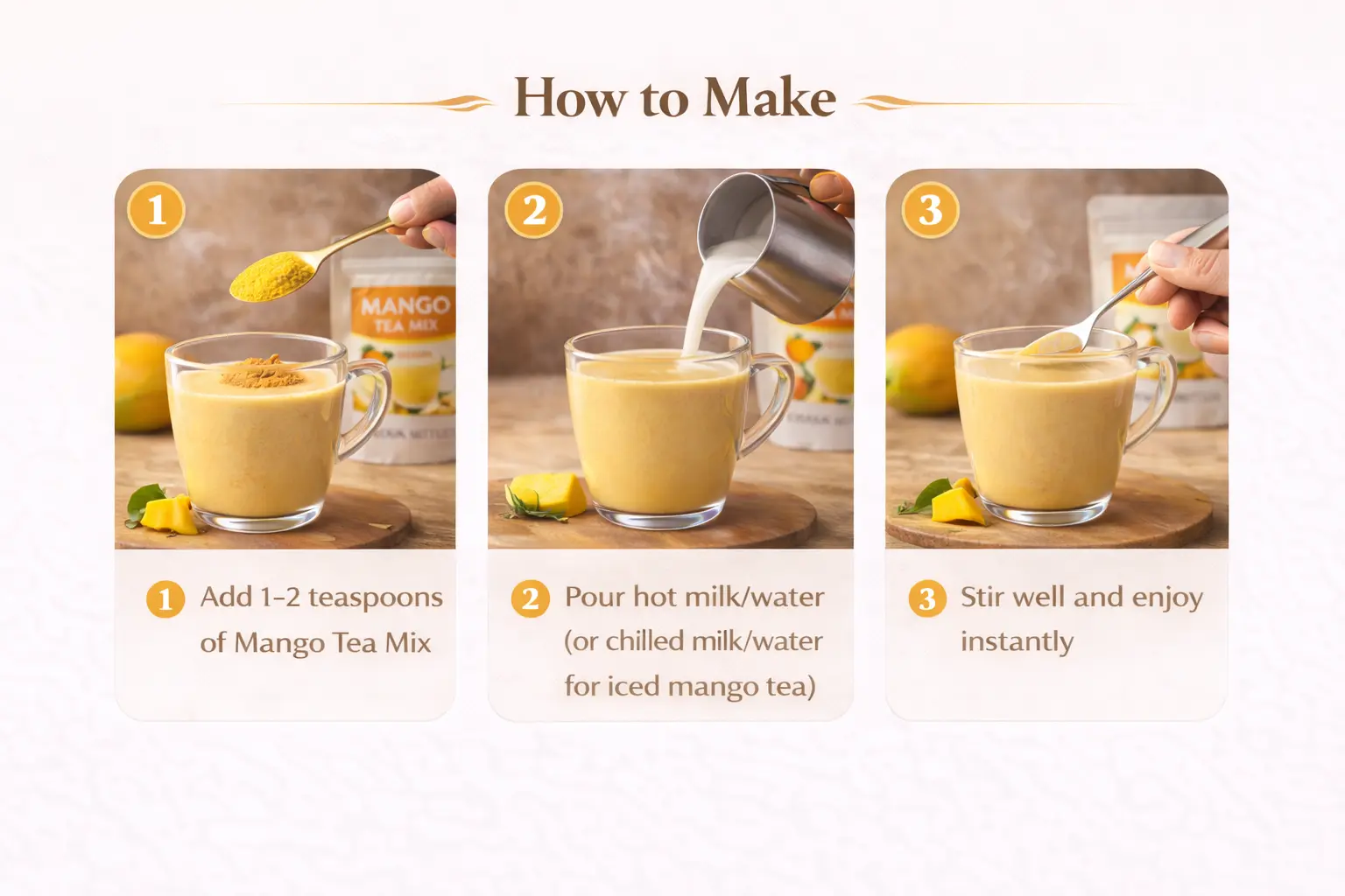 Mango Tea Mix brings a sweet and fruity flavour that reminds you of summer, holidays, and childhood memories — now in a cup you can make instantly at home.