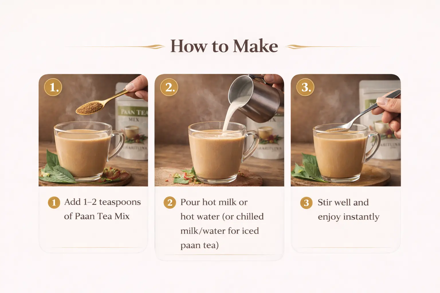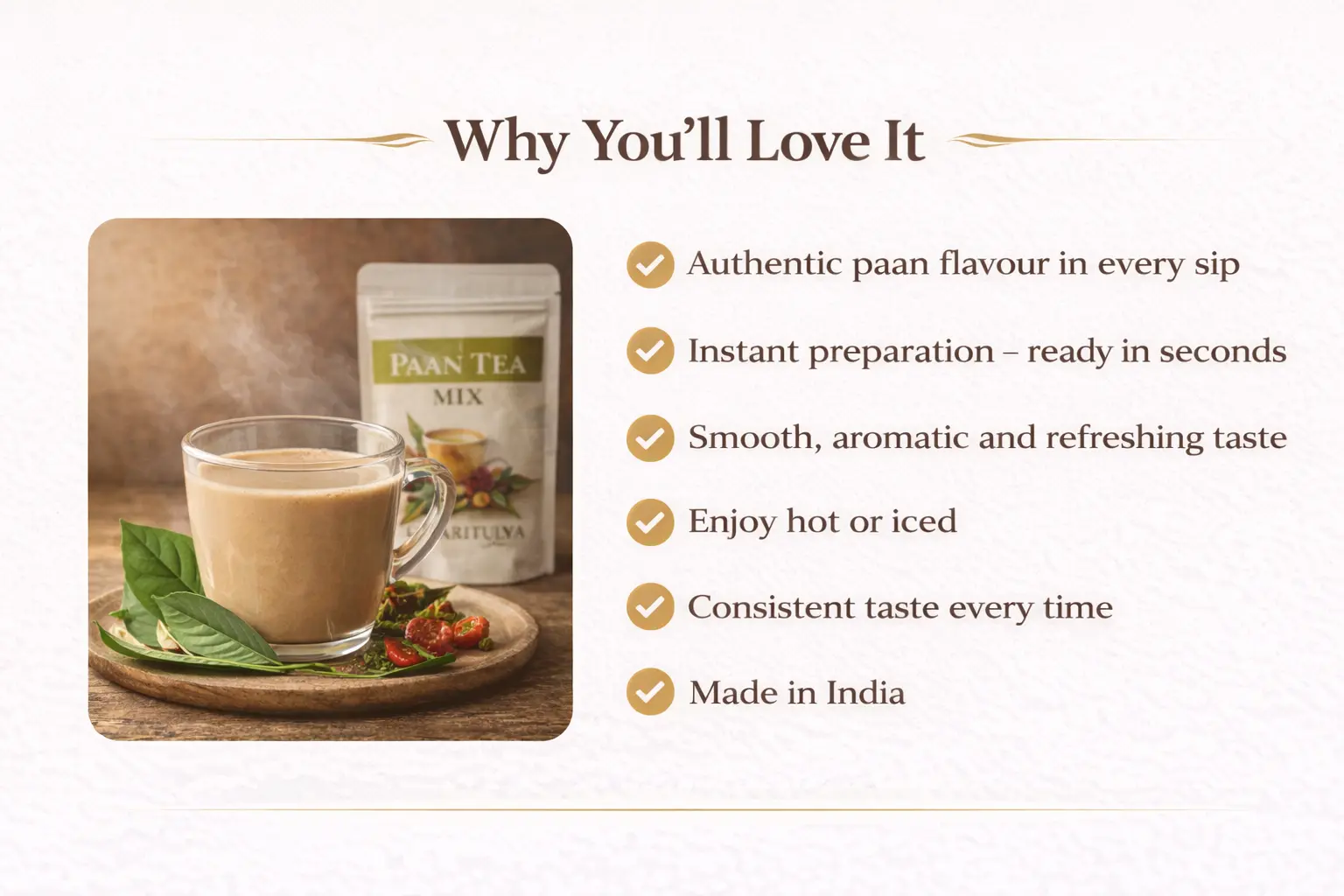 Paan Tea Mix brings the unique flavours of India to your cup within seconds — no boiling or brewing required.