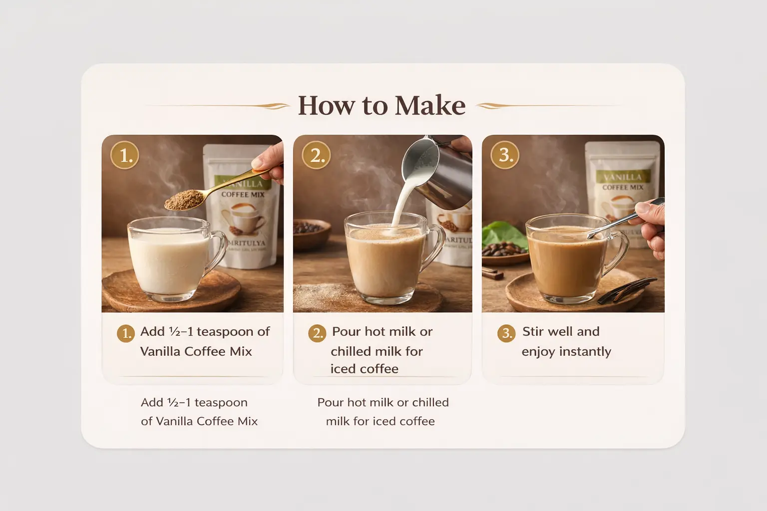 Vanilla Coffee Mix delivers a café-style experience at home in seconds—no boiling, brewing, or complicated preparation required.